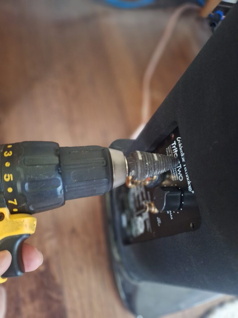 There is a downside to this method, which is that lots of metal shavings end up inside the speaker. I did most of the drilling with the speaker set down so I could push straight down. When I lifted it back up I could use a strong magnet to easily get all the shavings out.