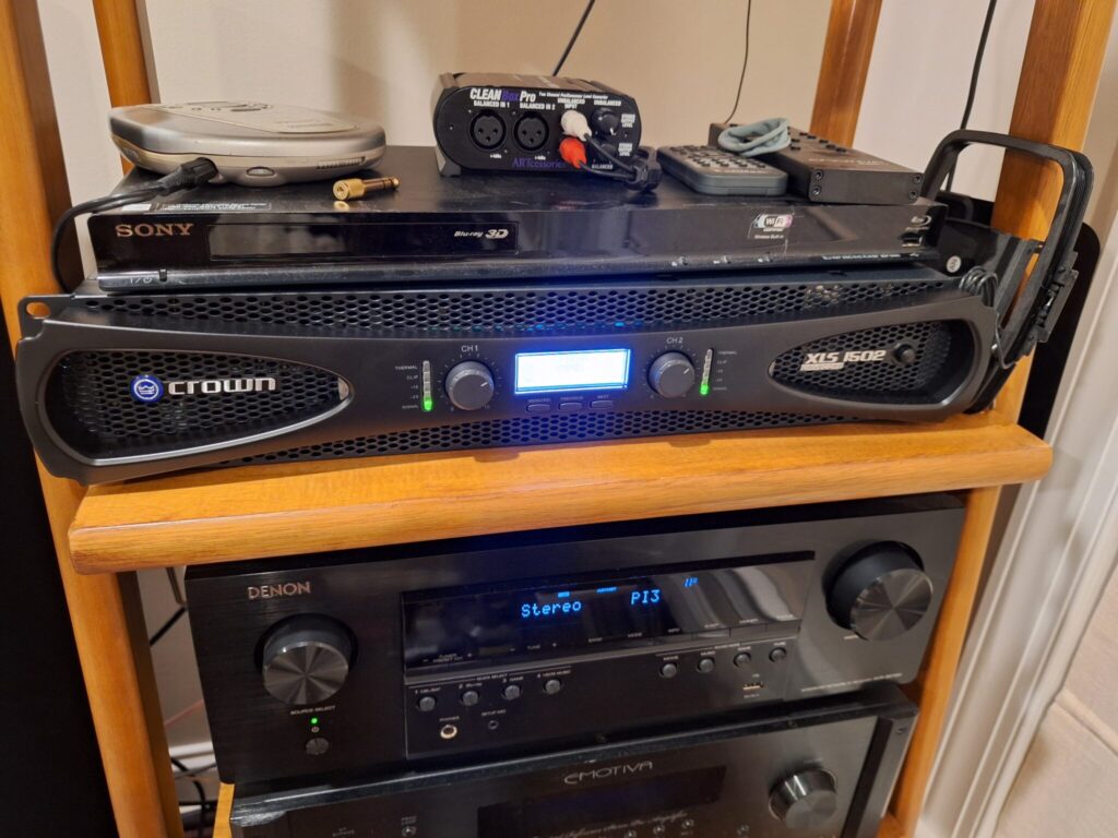 I ended up going with the Crown XLS1502 2-Channel Class D amp. It has enough power for my typical listening levels. When I first hooked it up, I wasn’t able to get the signal above the first level indicator from my Denon’s subwoofer pre-amp outputs, so I purchased an ART CLEANBox Pro Dual Channel Level Converter and some XLR cables. I set the amp to stereo mode and configured a low-pass filter on each channel at 50 Hz for nice DSP.